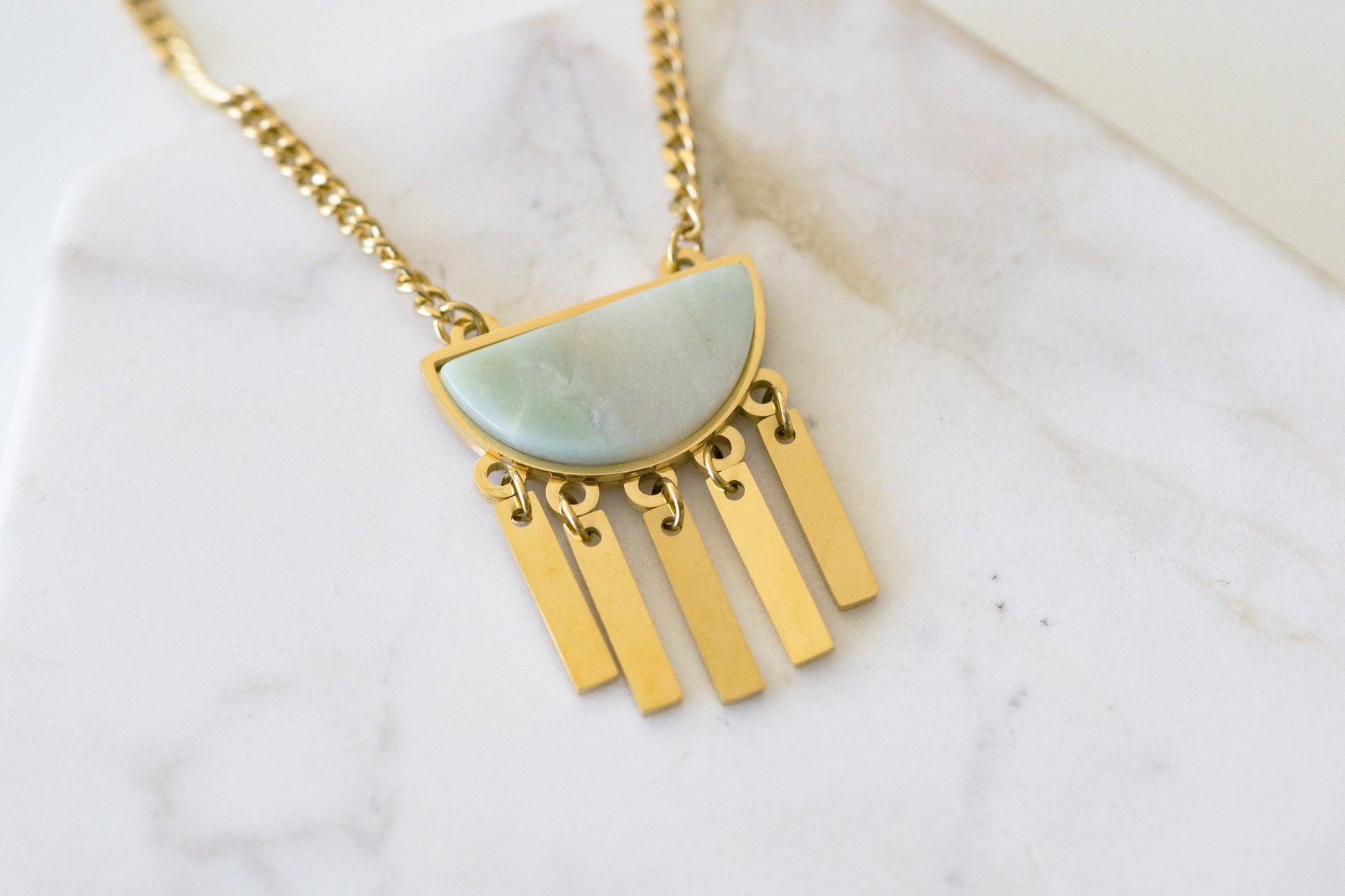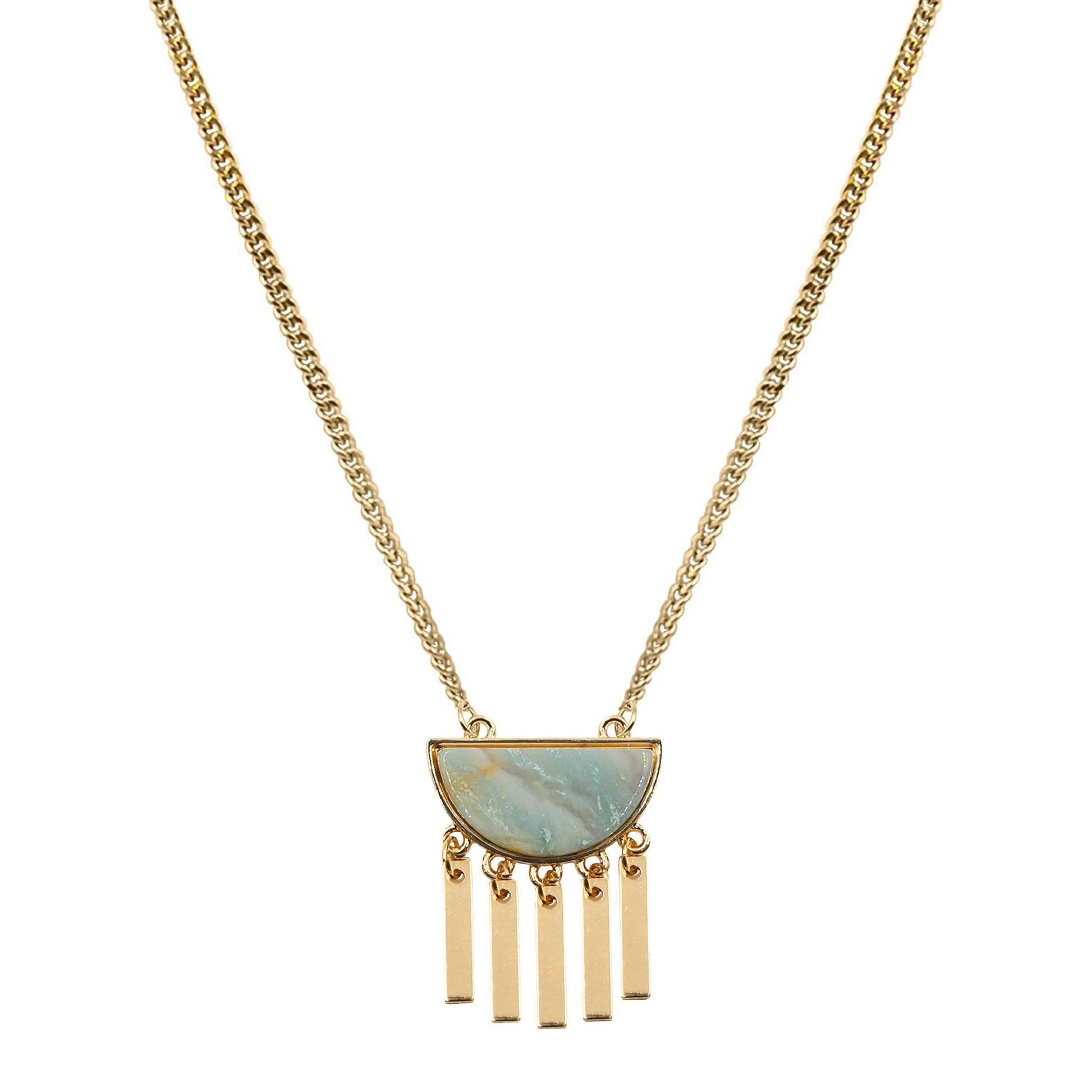 Gold And Light Blue Aztec Bar Fringe Tassel Hypoallergenic Nickel Free Pendant Necklace. Custom Amazonite Raw Natural Stone Accents And Designed With Love In Texas. Size 18, 22, or 26 Inch Length, Plus 3 Inch Attached Necklace Extender With Custom Sizing Available On Select Pieces.