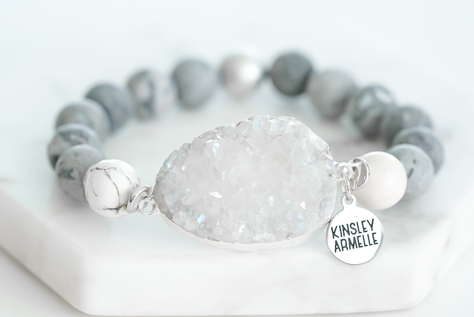 Silver And Gray Marble Hypoallergenic Nickel Free Beaded Stretch Bracelet. Custom Druzy Raw Natural Quartz Stone Accents And Designed With Love In Texas. Size Small, Medium, Large, and Extra Large Ranging From 6.25 - 7.25 Inch Circumference With Custom Sizing Available On Select Pieces.